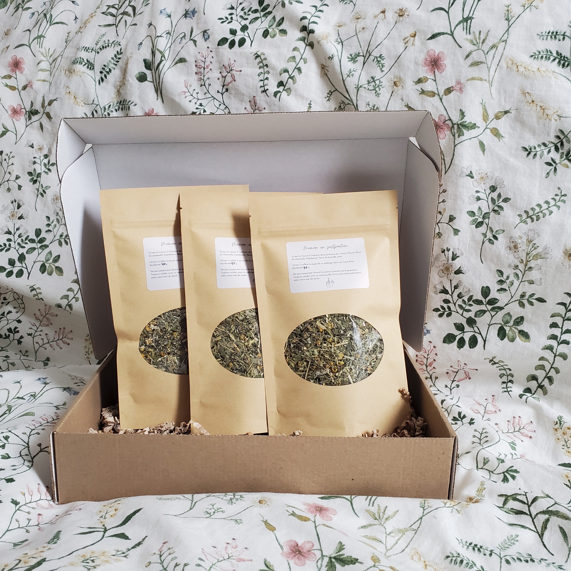 Le trio de tisanes est parfait pour une nouvelle maman qui désire préparer des boissons chaudes qui soutiendront ses changements hormonaux, favoriseront la détente et la lactation et offriront un espace propice à la guérison.